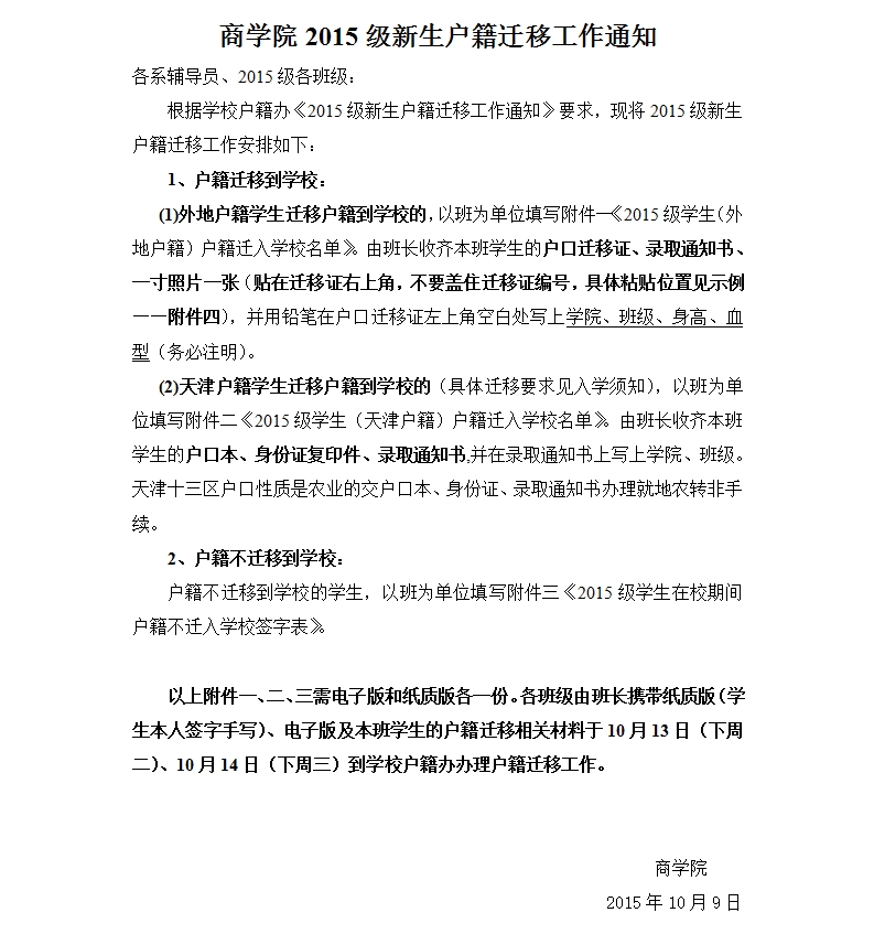 商公司2015级新生户籍迁移工作通知