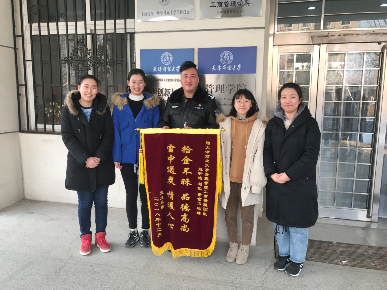 12月28日晚,英国上市官网365工商管理类1801 班赵轩逸、刘忆、董金玉、冯源四名同学,在校外乘坐出租车时捡到一个皮包,内有证件、银行卡等贵重物品及近1万元现金。返校后,她们立即报警,将拾到的物品原样交给佳荣里派出所。当晚11点多,警方联系到失主,并将物品奉还。