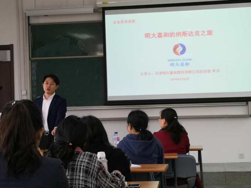 李洋总经理从“美国资本市场简介、明大嘉和IPO概述以及公募融资计划”等方面为师生作了精彩讲座。