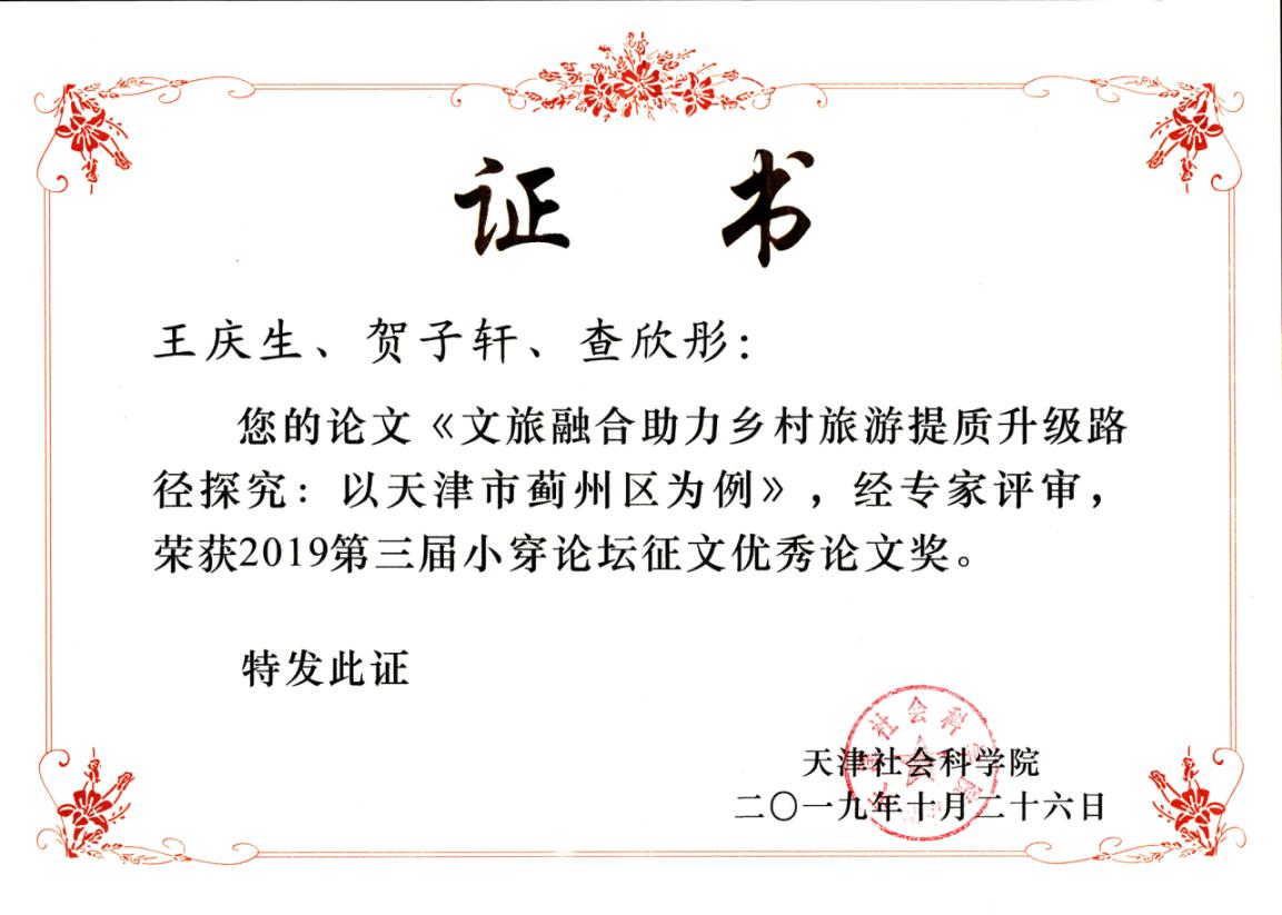 论坛以习近平新时代中国特色社会主义思想为指导思想,精准聚焦于乡村振兴、乡村旅游和全域旅游三个方面,积极探索农村农业发展新模式,得到了天津市政府和各界专家学的大力支持。论坛召开前的论文征集,共收到全国20个省(市)高校、社科院、政府部门以及科研智库机构等54位作者的论文70篇,其中评出优秀论文10篇。英国上市官网365有4篇论文入选大会论文集,王庆生、贺子轩、查欣彤的论文“文旅融合助力乡村旅游提质升级路径探究:以天津市蓟州区为例”获优秀论文奖。这也是英国上市官网365连续两届获评优秀论文奖。